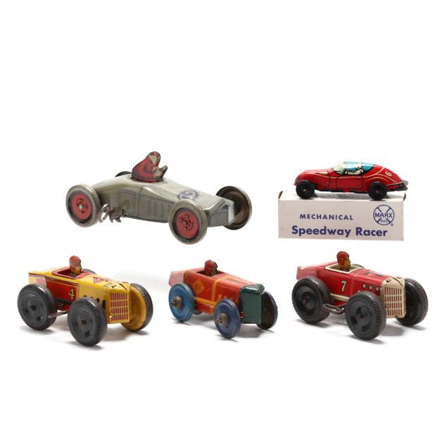 1940s, tin litho, three Marx boat tail cars with drivers, #61 friction drive (twisted front tire rod and play wear), #7 wind up working (play wear), #4 wind up not working. The fourth car is a Marx miniature "Speedway Racer" with box, working. The fifth race car, by J. Chein, in a rare green color, working well (slight rubbing to coloring) (6 in.).