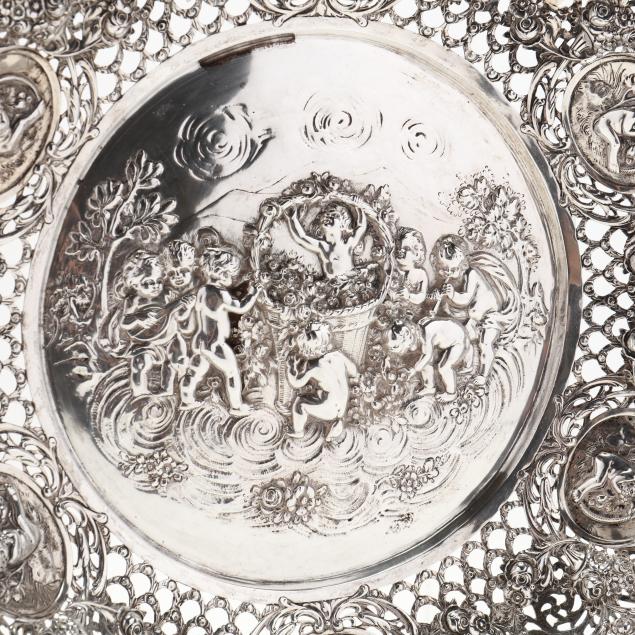 German, circa 1900, in the manner of the Hanua silversmiths, crown hallmark with .800 fineness mark to underside, hexagonal form, the center with repoussé sterling putti and floral cloud scene, reticulated cavetto with six repoussé putto medallions and floral garland designs.