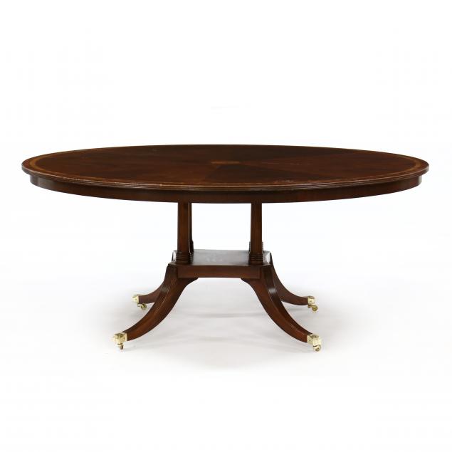 Circular top with banded inlay, reeded edge, quadruped pedestal with turned columns, lower shelf, down-swept legs with brass paw feet and casters. Accompanied by a custom pad to protect top.