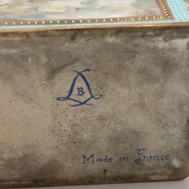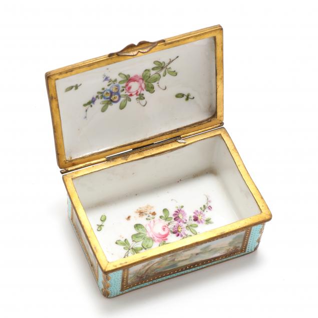 France, likely Belle Epoque era, bearing mark to underside, rectangular form with ormolu rim, the sides and cover with hand painted landscape and genre vignettes within gilt cartouches and a cobalt turquoise hue field, interior with painted floral decoration.