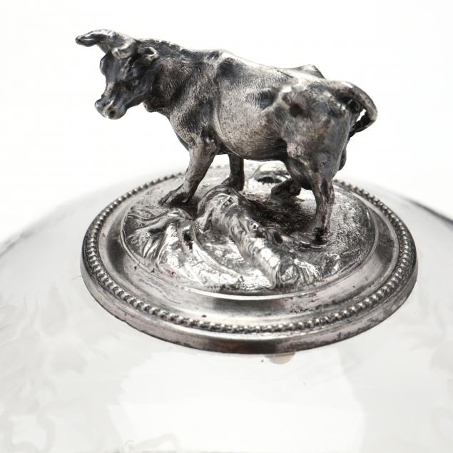 The dish marked for .800 silver and Sfriso of Venice, the silverplate cow finial capping the etched glass dome is unmarked. Possibly an associated set.