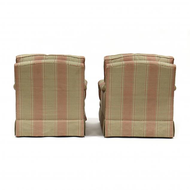 Contemporary, including a pair of club chairs with loose down-filled back and seat cushions, and one rectangular pillow-top ottoman on casters, labeled.