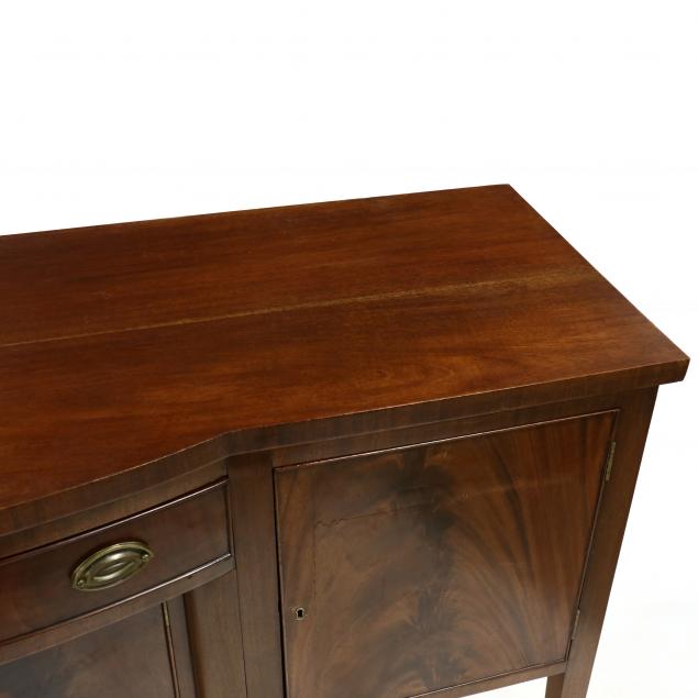 Mid 20th century, mahogany veneer, shaped rectangular top with a vertically veneered edge, central cock beaded drawer over two hinged cabinet doors flanked by two hinged cabinet doors raised on square tapered legs.