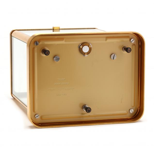 Swiss made, cal 540, brass and glass case, (13) jewels, fall front glass panel, locking slide mechanism for pendulum, marked.