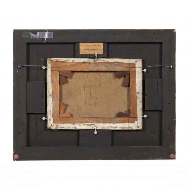 Oil on canvas, twice signed (at lower left and directly below point of woman's walking stick), presented in a later gilt composition frame, the verso with affixed artist's card with hand-written inscription reading "Catalogue No. 27 / O'Er the Grassy Lea / Spring Exhibition 1920."
