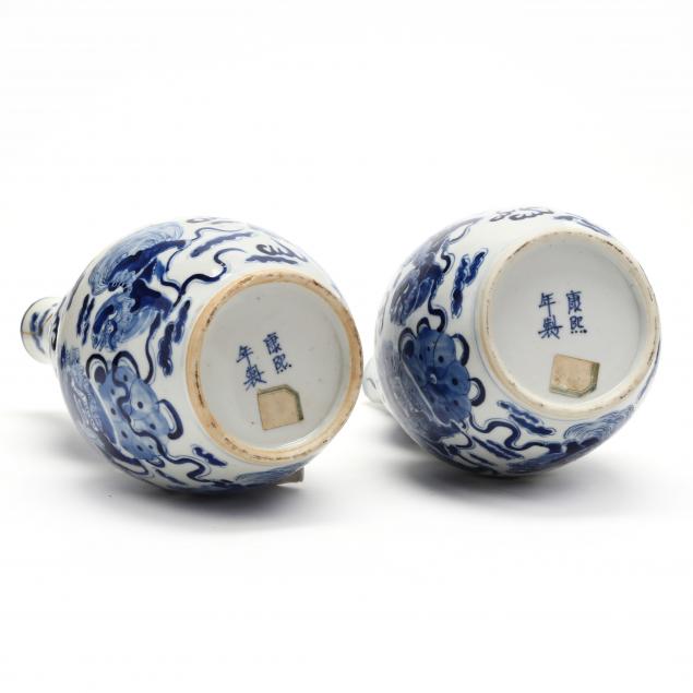 Double gourd shaped vases hand painted with foo lions having large full tails and manes, amidst Chinese style clouds, an apocryphal Kangxi four character mark to underside of each.