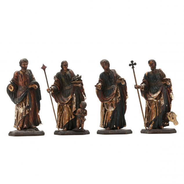 19th century, possibly earlier, four polychrome painted and parcel gilt saints mounted upon a shaped wood terrace, all with hand-numbered inscriptions No. 1-4 to verso, including two with antique label remnants.