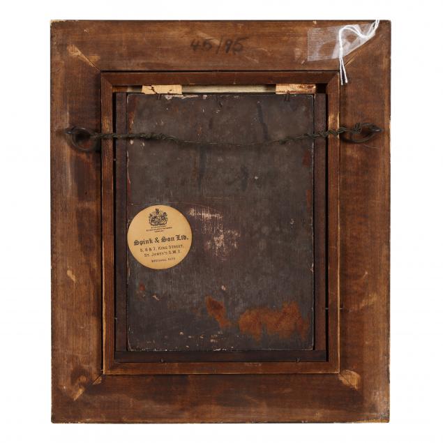 Oil on panel, unsigned, presented in an antique gilt frame with silk liner, retains an old Spink & Son Ltd. of London label to verso.