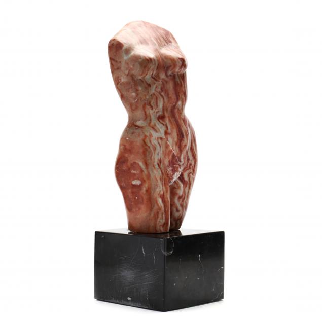 Midcentury, carved and polished red marble, naturalistic form mounted upon a cubic black marble plinth, appears unsigned.