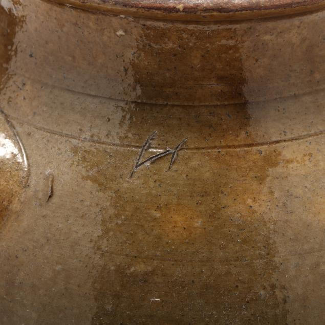 Early 1900s, Aiken County, stoneware with an ocher Michigan slip glass glaze, three gallon form as indicated by slashes on the shoulder, fluted neck above decorative lines, tapered body, not signed, see "Great and Noble Jar" fig. 4-18 for a similar example.
