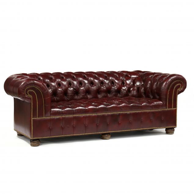 Late 20th century, oxblood leather with rolled and tufted back, arms and seat, brass nail head trim, turned wood feet, labeled.