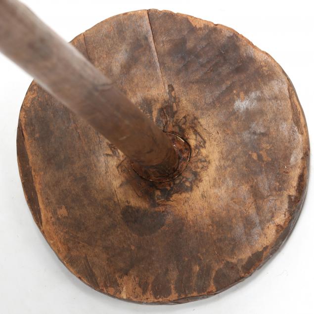 Early 20th century, pine lid, churn and bottom, enameled metal tapered container with metal spout.