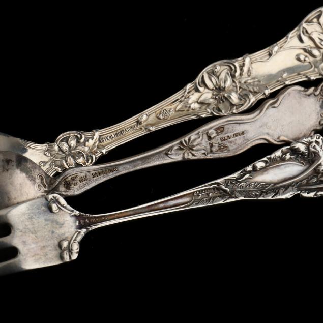 sugar tongs (4 1/2 in.), Reed & Barton Love Disarmed berry fork (4 7/8 in.). Sugar tongs with script monogram, all others without monograms.