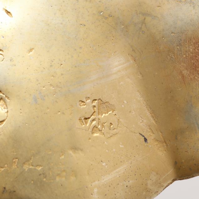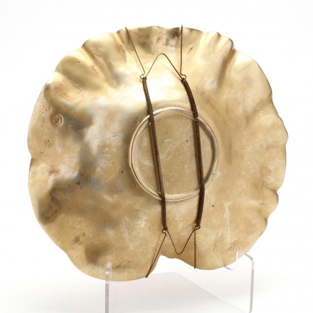 Anodized metal, possibly aluminum, with impressed Virginia Metalcrafters logo mark along with faint Harvin Co. mark and pattern number to underside.