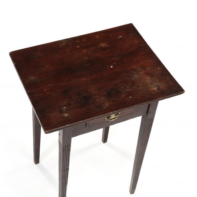 Attributed to Virginia, early 19th century, poplar with a reddish-brown wash, poplar and yellow pine secondary, one board rectangular top, single molded and lipped drawer with dovetailed joinery, inset skirt rail, raised on tall square tapered reeded legs (the table finished on all sides).