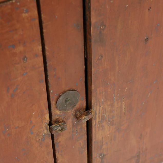 Circa 1800, white pine with old likely original red wash, rectangular case, two hinged batten doors, shelved interior with old blue interior paint.