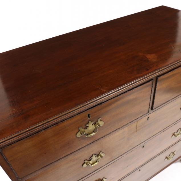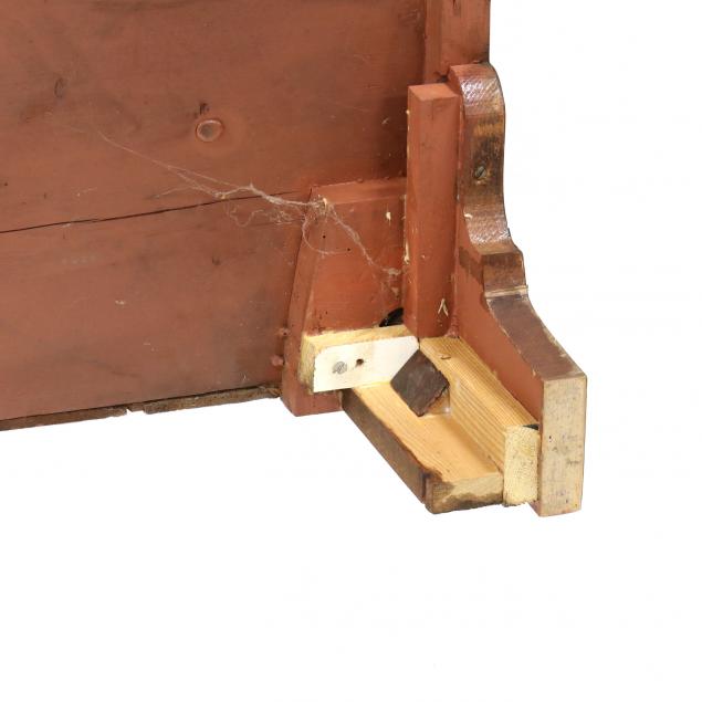 Early 19th century, pine secondary, top with applied molded edge and rear overhang, the case with two over three graduated drawers featuring a beaded edge, shaped bracket feet.