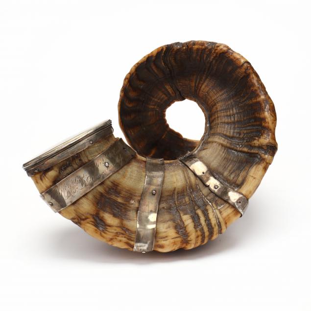 Late 18th century-early 19th century, an authentic ram horn mounted with silver fittings, silver without maker's mark (silver content unknown, test silver), hinged lid engraved with period dedication for the 21st Light Dragoons cavalry regiment of the British Army: "XXI LD" (top lid) "The Gift of Lieut. A. M. L. D. Cardonnel / to the 21st Lt. Dragoons MeSs."