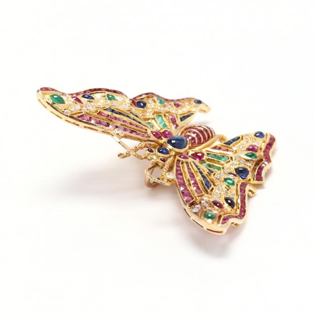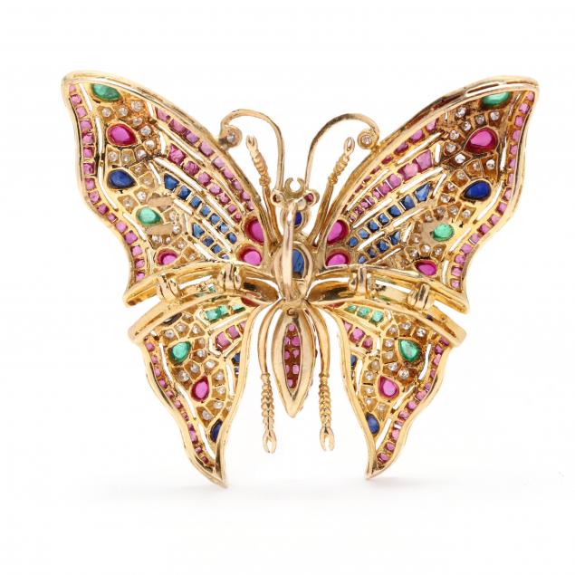 The butterfly with with articulated wings and body and finely set with cabochon and faceted rubies, emeralds, and sapphires and with full cut round diamonds weighing approximately .21 total carats (I-J color, SI-I clarity), with fixed bail and testing 18KT.