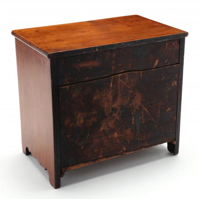Attributed to Kentucky, circa 1820-40, white pine secondary, rectangular top with rounded corners, three graduated flush drawers with dovetailed construction, flush sides with scalloped skirt, cut-out scalloped front skirt.