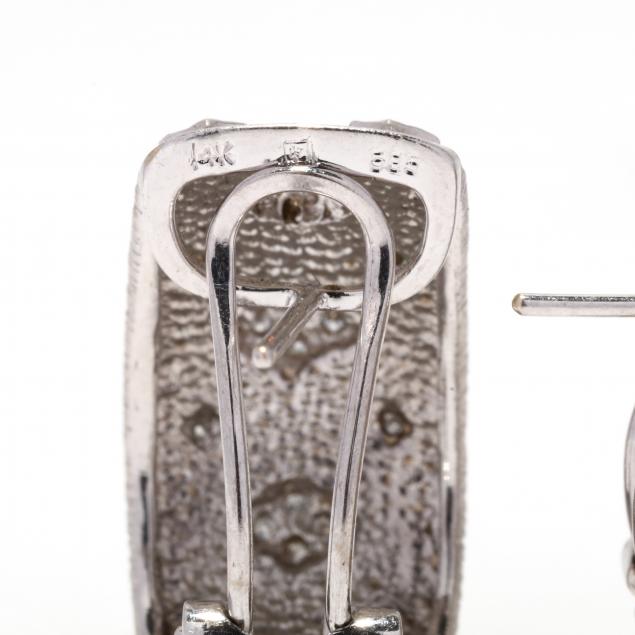 The first in a half hoop design with a textured surface with raised diamond shaped bezels and set with full cut round diamond accents weighing approximately .20 total carat (H-I color, SI clarity), completed with posts and omega clip backs, stamped 14K 585 and with mark P (7/8 in.); the second a pair of hinged hoops set in a diagonal motif with colorless and black diamond accents, completed with posts, stamped 14K 585 and with maker's mark S (1 1/8 in.)