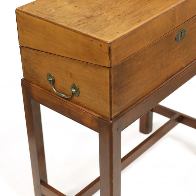 19th century cherry lap desk with poplar secondary, hinged lid with interior hinged panel writing surface, the box with bail handles and single flush drawer to the right side, set on a later custom mahogany Chippendale style stand.