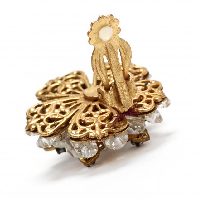 To include: a necklace with greenish yellow rhinestones in varying cuts, completed with a hook and eye clasp, signed Schreiner (adjustable 13 in. to 15.5 in.); a corresponding bracelet in a similar motif, completed in an integrated clasp with safety chain, signed Schreiner (7.25 x 1 1/8 in.); a necklace with iridescent blue rhinestones and faux pearl drop to detachable pendant / brooch, completed with a hook and eye clasp, signed Vendome (adjustable 14.75 in. to 17 in.; pendant / brooch 3.5 x 2 in.); corresponding earrings with iridescent blue rhinestones and faux pearl drops, with clip backs (2.25 x 1 in.); a gold tone floral necklace with colorless rhinestones to flower and vine motif, completed with a hook clasp (adjustable 14.5 in. to 16.5 in.); and a pair of beaded earrings in a flower motif with colorless and frosted rhinestones, with clip backs, signed Robert (1.25 x 1.25 x .75 in.).