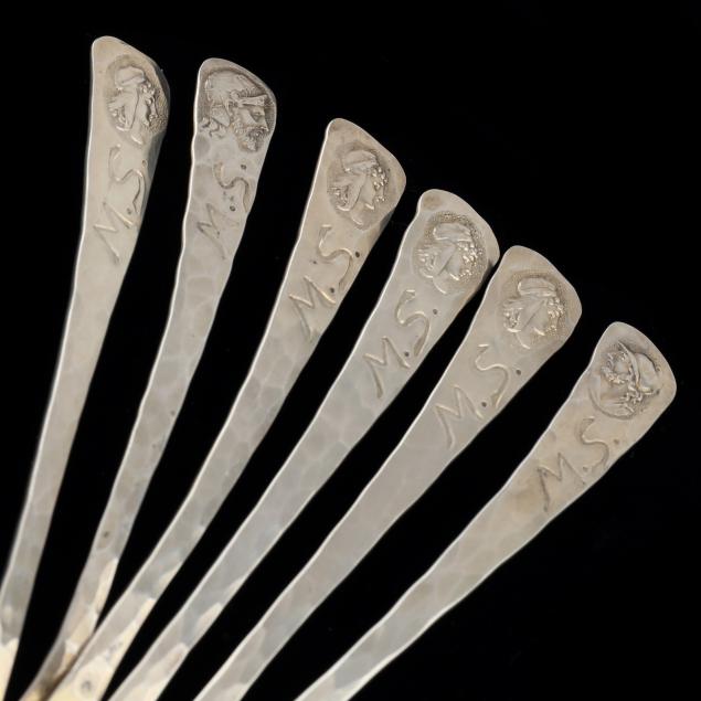 Unusual three tine form with partial gilding, matte finish, each handle featuring a classical style portrait medallion against a hammered ground and period "M. S." incised monogram.