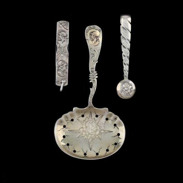 The first a Sterling & 14K gold bon bon scoop (5 in.); the second a pair of sugar nips (3 1/4 in.); and the third a pocket knife (2 1/2 in.).