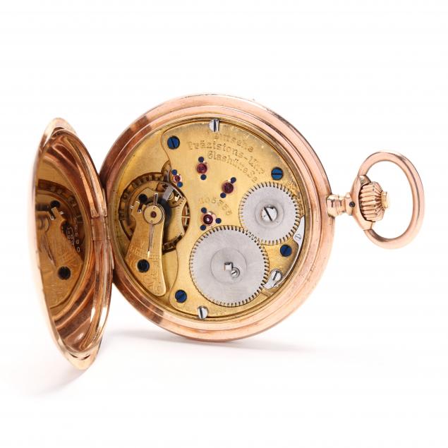 Stem wind and lever set, with polished yellow gold case, the white dial signed Glashütter / Präzisions-Uhren-Fabrik / Akt.-Ges / Glashütte, with black Breguet Arabic hour markers and with blued steel spade and whip hands, subsidiary dial at the 6:00 hour and dial with outer five minute register, the jeweled movement signed Deutsche / Prazisions-Uhr / Glashütte, Sa and numbered 205355, case and curvette signed, stamped 14K / 585 / 56 and numbered 205355.