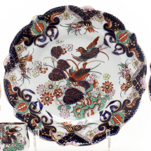 First half 19th century, Orientalist design featuring a scalloped border decorated with diaper triangles, unfurled ribbons and flower heads over two birds in a flowering bush: (17) dinner plates (10 1/2 in.); (12) soup dishes; (16) luncheon plates (9 1/4 in.); (10) punch cups (2 1/2 x 3 x 2 1/2 in.).