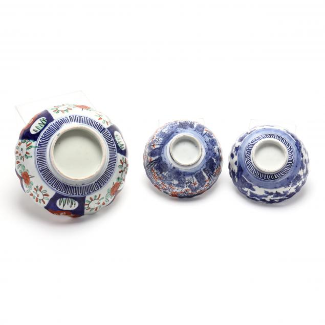 20th century, includes three bowls, the first having a scalloped rim and hand painted with Imari style patterns (4 1/4 in., 10 in. diameter; some nicks to rim), the second smaller bowl having a scalloped rim and hand painted with sages in a bamboo forest encircling the interior (3 1/4 in., 7 1/4 in. diameter; hairline crack to underside; firing defect to rim), and the third having a scalloped rim and hand painted in blue with pine trees (3 1/4 in., 7 1/4 in. diameter; hairline crack to underside, firing defect to rim.)