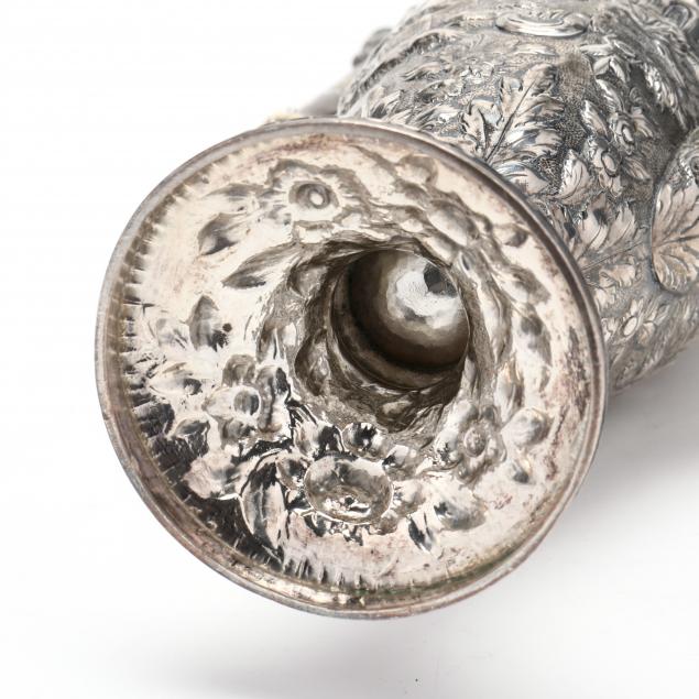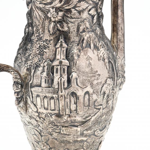 Circa 1860, Baltimore, Maryland, the body decorated with a scenic landscape setting surrounded by floral designs on a stippled ground, stag finial lid and angled ram's head handle, with later heraldic monogram with "B. Andrews 1919," to body, marked "S. Kirk & Son / 11 oz." to base rim.