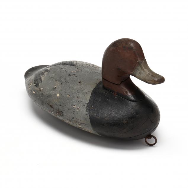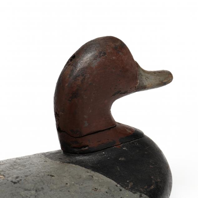 Perryville, Maryland, this attractive decoy is known as his "pancake model" as it has a flatter body which rode well on the Chesapeake chop, it retains an attractive alligatored gray paint.