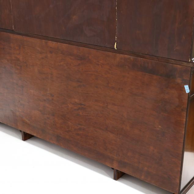 Mid 20th century, labeled "made by Joseph Gerte Co. / Boston," multi-part form, fine quality craftsmanship featuring a traditional breakfront form, peaked pediment with pierced carved shell and egg-and-dart molding above dentil molding, astragal mullioned doors, shelved interior with gold-tone papered interior, projecting base with four graduated drawers, flanked by two small upper drawers above two hinged cabinet doors, flush flat form base.