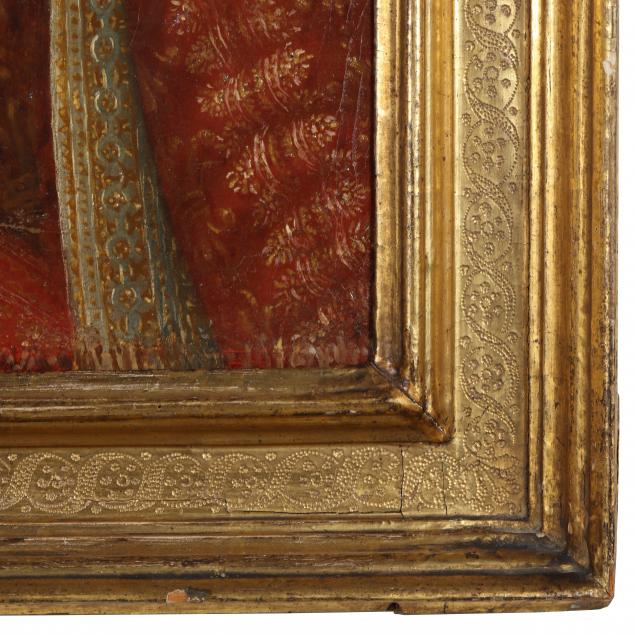 Extensive stable craquelure; obscuring varnish; evidence of retouch to dress under UV light; minor chipping to frame.