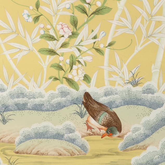 Mid-20th century, hand-painted paper mounted on a canvas wallpaper backing, each panel depicting a scenic bamboo and peony blossom grove with various birds and butterflies on a lemon yellow field.