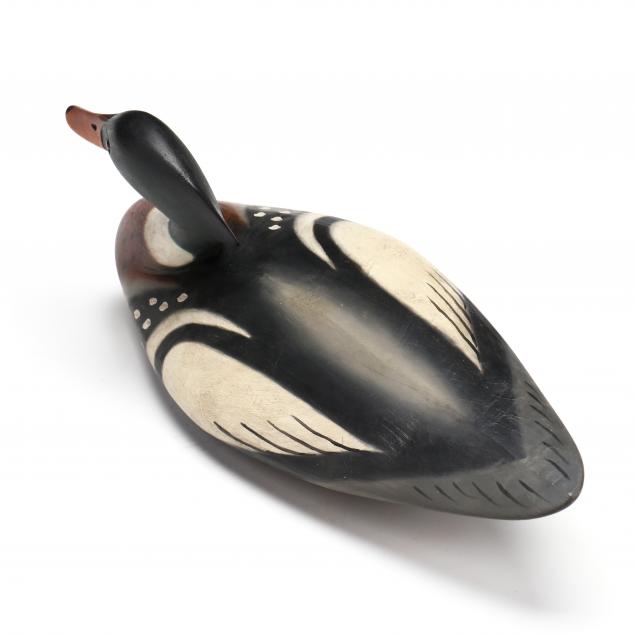 Cape Charles Virginia, this racy merganser was made in an era which is widely regarded as the time he created his finest decoys, the form is his own style and paint is stunning and imaginative; signed and dated 2008.
