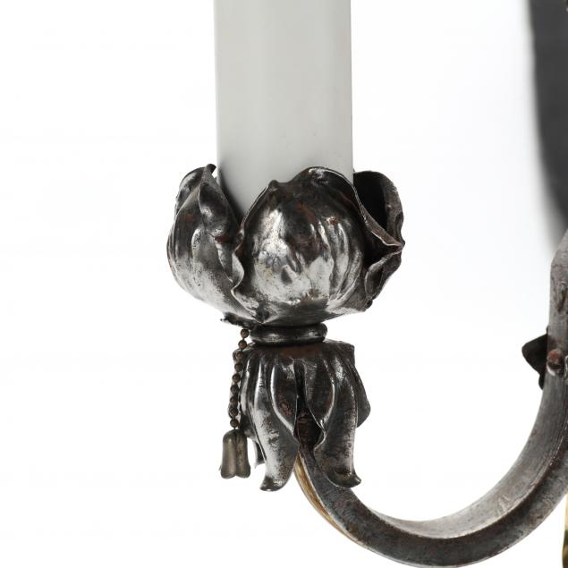 Electrified two light form, steel upswept arms terminating in floral sconces, heart and spear finial, supported by a cast brass spiral column and four scrolled feet, round black hardstone base, includes shades.