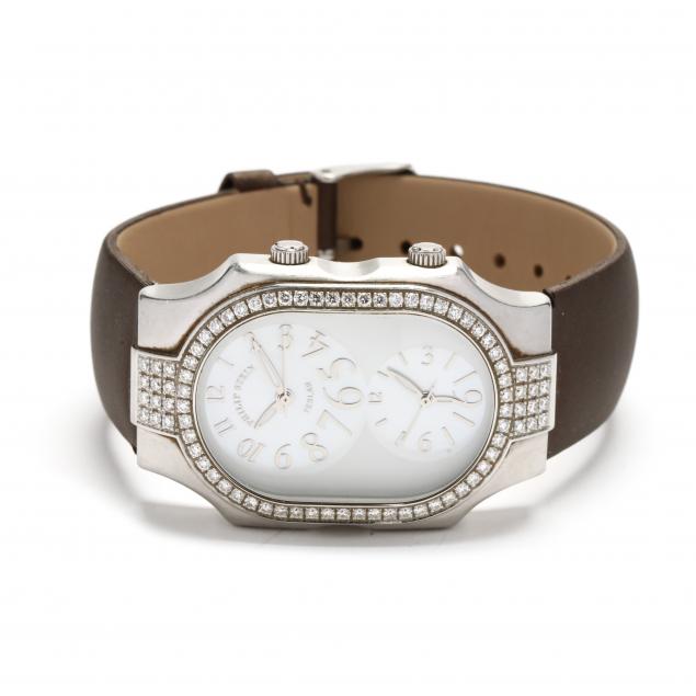 Quartz movement, the stainless steel case set with full cut round diamonds weighing approximately 1.64 total carats (G-H color, VS-SI clarity), the white dial with mother-of-pearl dual time subdials with applied silvertone Arabic numeral and bar hour markers, with luminescent hands and seconds hand sweep, completed with a signed leather topped brown sateen strap band, case back signed and with serial #2TFO20633.