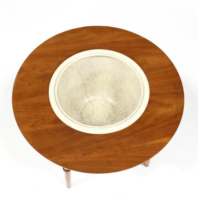 1960s, cherry with speckled ceramic insert, circular top, rounded tapered legs with shaped stretcher, unmarked.
