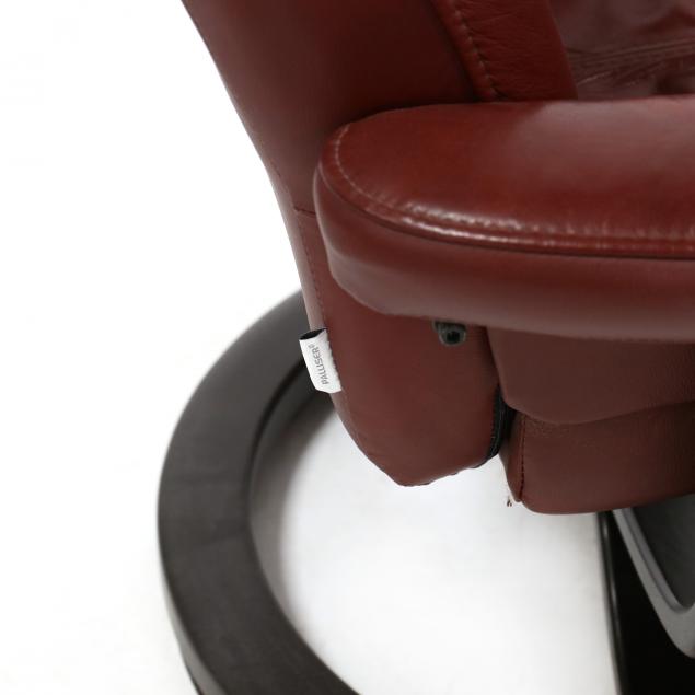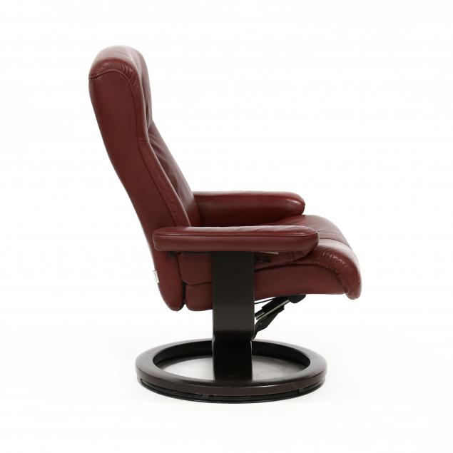 Late 20th century production, oxblood leather, the swivel chair with reclining mechanism under the proper right arm, conforming stationary ottoman, labeled.