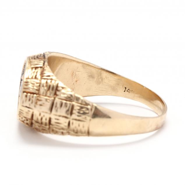 Ring with recessed blackened gold center set with three full cut round diamonds weighing approximately .53 total carat (H-J color, VS-SI clarity), mount with incised and textured detailing to shank, stamped 14K and with partial mark likely Artcrest.