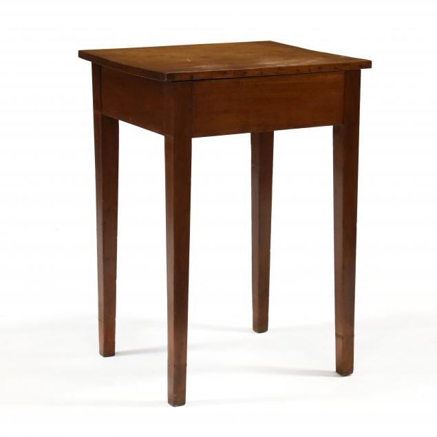 Probably Virginia, 19th century, poplar secondary, rectangular top, single flush drawer, tall square tapered legs, light wood line inlay, bottom of skirt with banded inlay, inlaid cuff at lower leg.