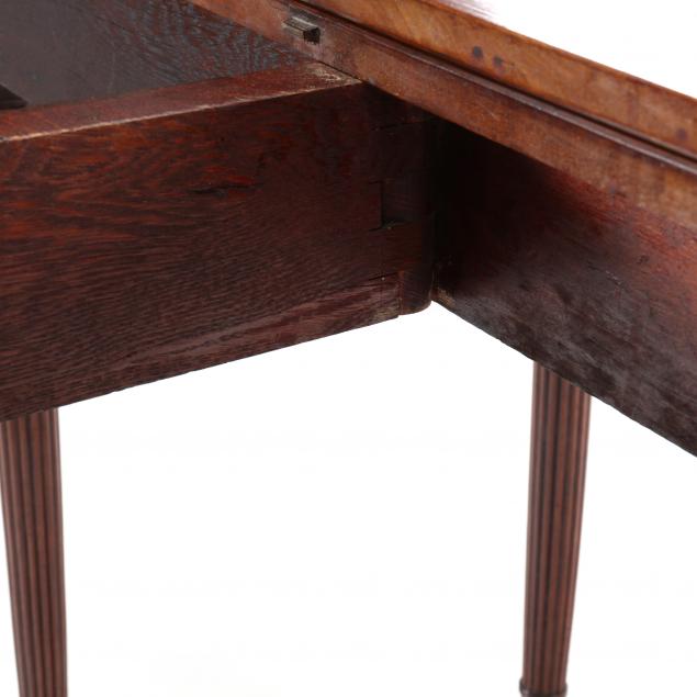 Attributed to Maryland, circa 1810-20, poplar and oak secondary, shaped hinged lid with gate-leg support, reeded front edges at top, distinctive stepped center section featuring a book-matched veneered skirt with central rectangular panel having a cock-beaded edge, each upper stile with relief carved rosette, four tall ring turned and tapered reeded legs.