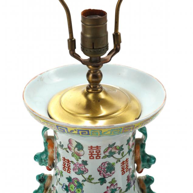 With longevity and double happiness symbols together with peaches, pomegranates, and auspicious sprays of flowers, mother and baby foo lions flank either side of the neck, drilled and fitted with lamp mounts, with a single lightbulb fixture, come together with green fabric shade with golden red tassels, one vase slightly taller than other due to one lampshade harp being slightly taller than the other.