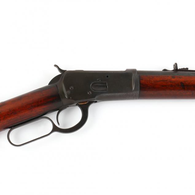 Serial number 446562 (1908 manufacture), 23 in barrel marked .38 WCF; walnut stock with original metal butt plate; left side of stock branded with written LV for Lem Virginius Dudley.