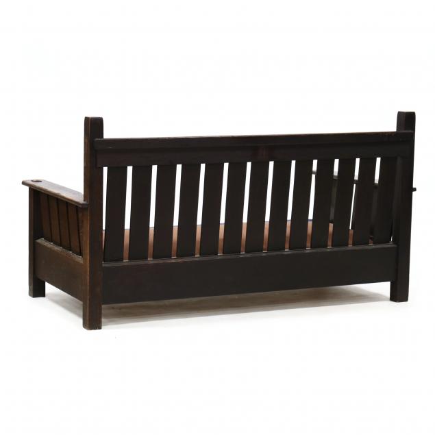Circa 1910, model 173 (now with cut-down arms, tall straight rear stiles with slightly pointed caps, wide crest rail with13-slat back, long plank arms with through tenon joinery, the sides with five slats each, straight legs, spring seat with six upholstered loose cushions, red label to back center of crest rail.