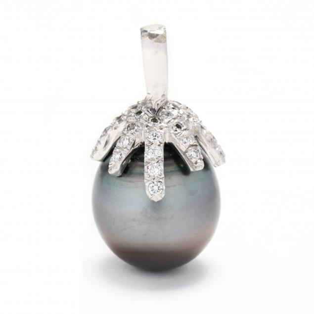 The Tahitian pearl (12.6mm) with a floral motif cap, cap and bail set with full cut round diamonds weighing approximately .40 total carat (G-H color, SI clarity), testing 14KT.