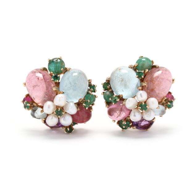 Earrings designed with a floral motif pearl cluster and emerald melee to center, and with cabochon aquamarine, pink tourmalines, and emerald, and further set with round cut emerald accents and an oval cut amethyst, completed with hinged posts and omega clip backs, stamped 14K.